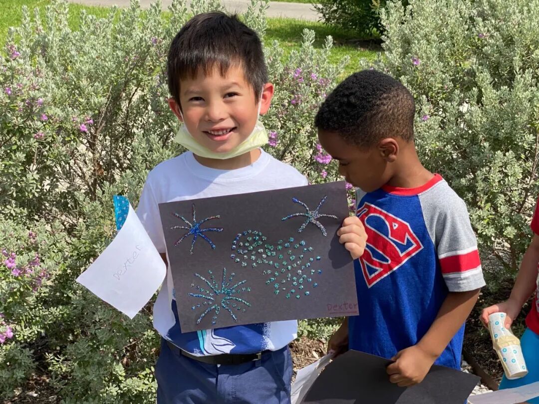 在老师的指导下,小朋友们通过胶水和闪粉制作出喜欢的烟花,